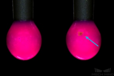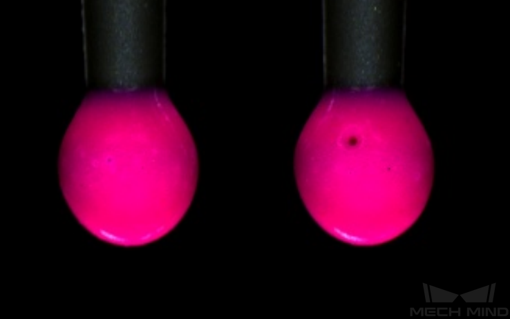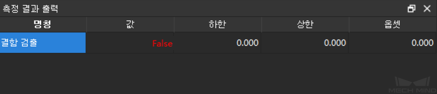 측정 결과 출력 과 결과 화면에서 검출된 결과를 볼 수 있습니다. 아래의 그림과 같이 이 예시 중 대상물체에 결함이 있으므로 결과가 False입니다. 대상물체에 결함이 없는 경우 결과가 True입니다.