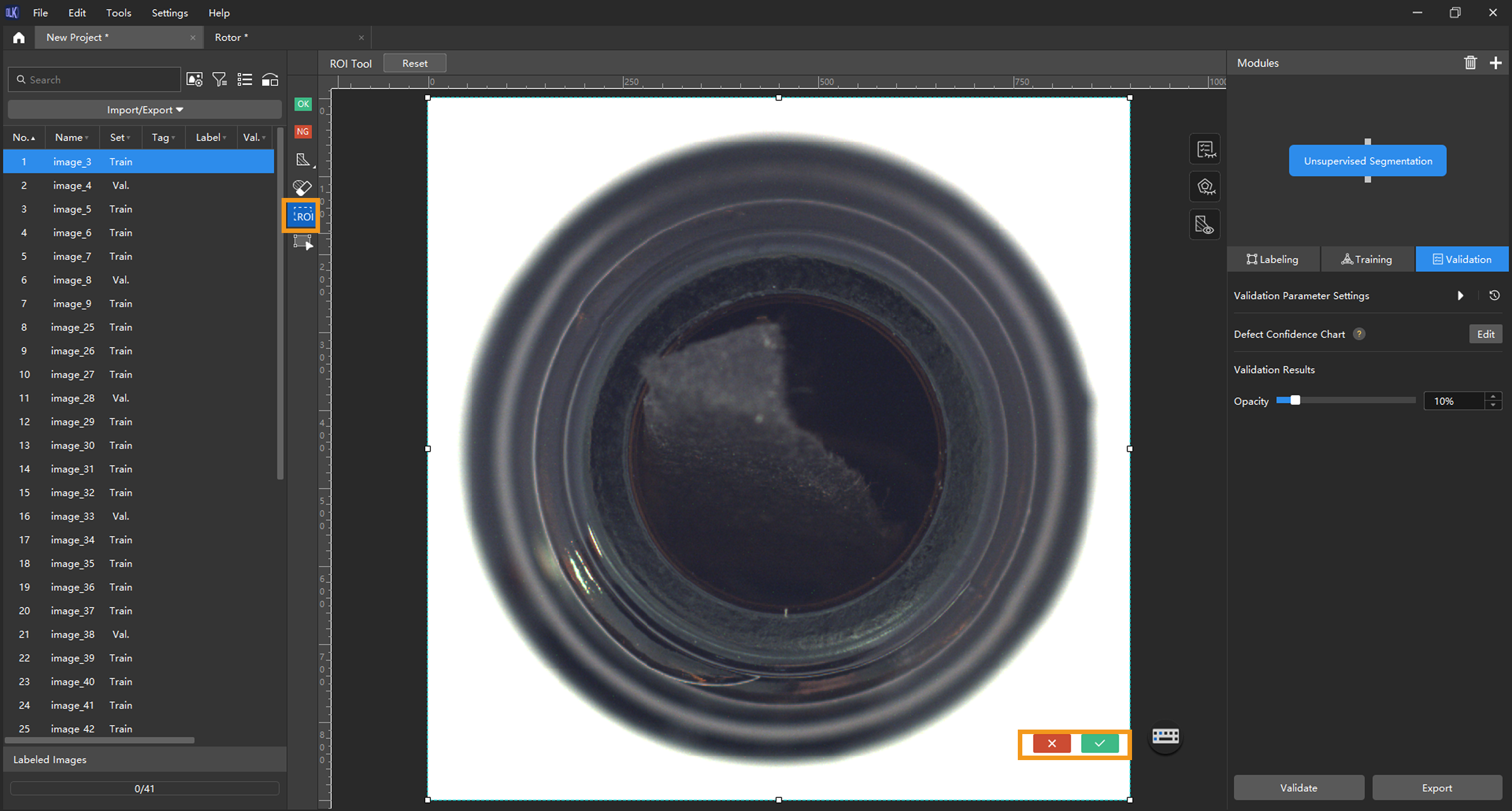 button in the lower right corner of the ROI to save the setting. Setting the ROI can avoid interferences from the background and reduce processing time, and the ROI boundary should be as close to the outer contours of the object as possible.The same ROI setting will be applied to all images, so it is necessary to ensure that objects in all images are within the set ROI.