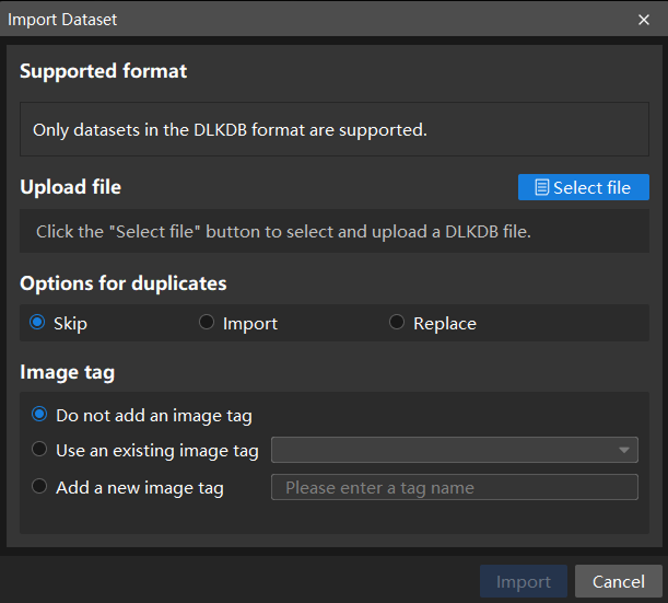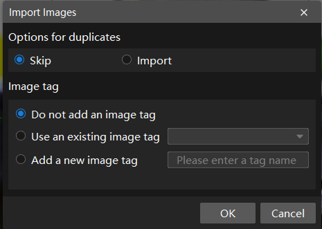 If duplicate images are detected in the image data, you can choose to skip, import, or set an tag for them in the pop-up Import Images dialog box. Since each image supports only one tag, adding a new tag to an already tagged image will overwrite the existing tag. When importing a dataset, you can choose whether to replace duplicate images.