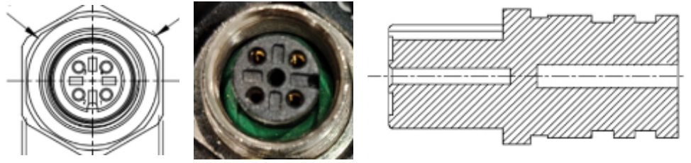 The real M12-A connector of the DC power cable is slightly different from the drawing: the real connector has an extra non-functional blind hole in the center. This blind hole serves no practical purpose. It does not alter the electrical characteristics of the M12 connector, or affect its connection and use with the corresponding socket. The following figure shows the drawing, the physical object, and a cross-section view of the physical object in order: