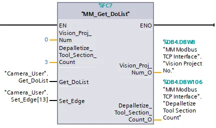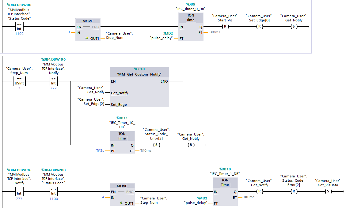 In this example, when “Camera_User”.Step_Num is set to 3 in the automatic mode, the value of “MM Modbus TCP Interface”.Notify is not 777. After the “MM_Get_Custom_Notify” command is enabled, when the “Camera_User”.Get_Notify variable is at the rising edge, the program retrieves the message from the “Notify” Step. If the message retrieval was successful, the value of “MM Modbus TCP Interface”.Notify changes to 777. Otherwise, if the value remains unchanged, the PLC will prompt an error after 3 seconds.