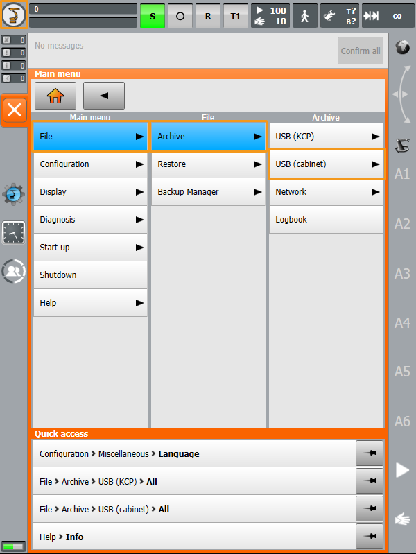 All teach pendant actions in this document are performed on KSS 8.6. The specific steps and menu selections may differ slightly in different versions of teach pendants. |