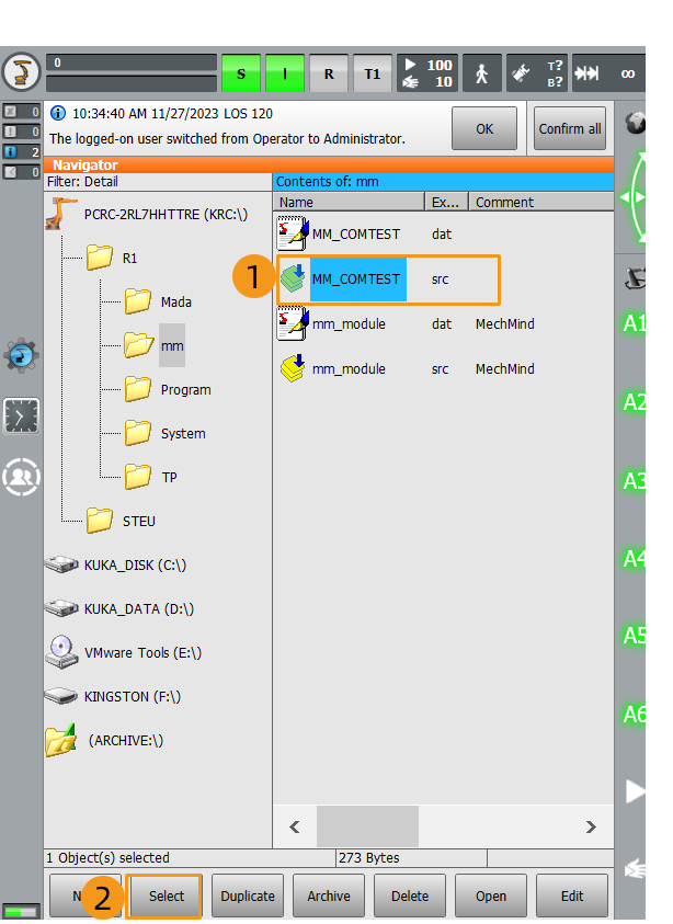 KRC:\R1\mmfolder, select MM_COMTEST.src, and then click Select.