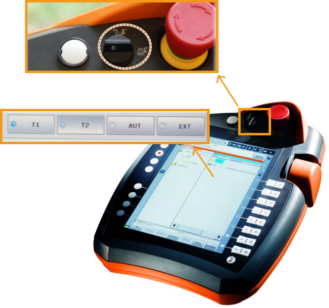 | T1 stands for the Manual Reduced Velocity mode, and AUT stands for the Automatic mode. |