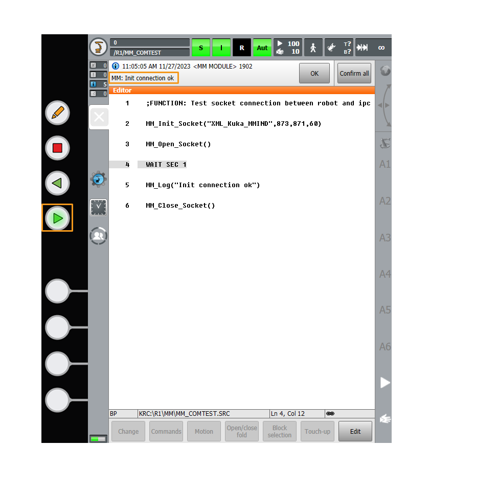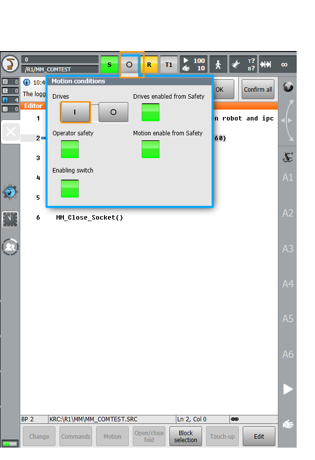 Press the white enabling switch halfway in and press the green start button to run the program. When R turns green, the program is running. After the program is run, MM:Init Connection ok is displayed. In this case, release the enabling switch.