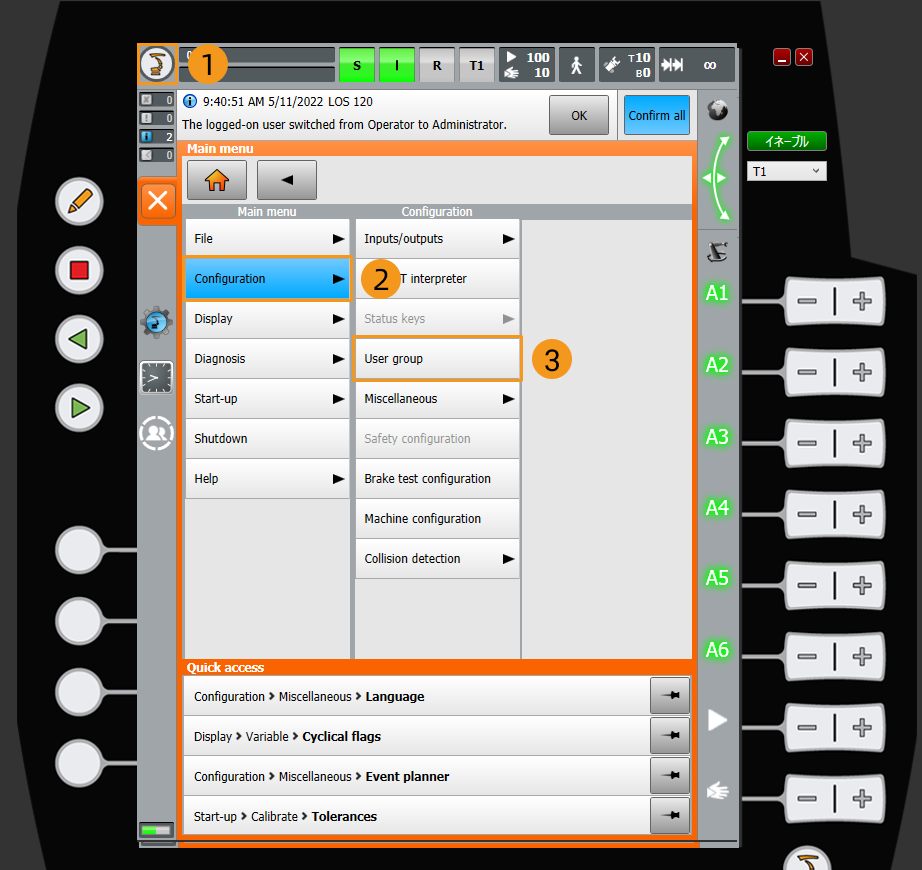 Turn the key switch to horizontal. Select the running mode, for example, T1 or AUT, in the pop-up dialog box on the screen. Then, turn the switch back to vertical.