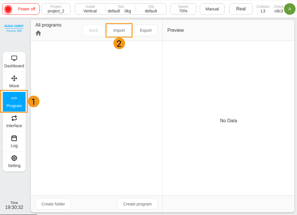 Click Program on the left side panel of the teach pendant. Click Import on the “All programs” panel.