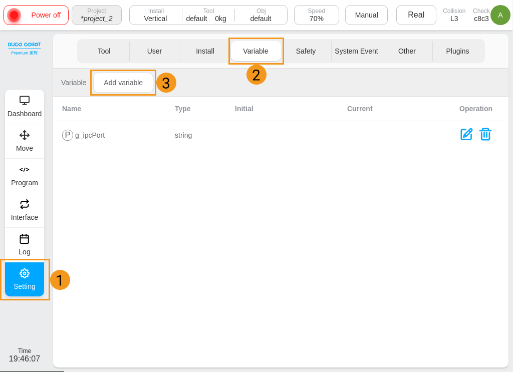 Click Setting on the left side panel of the teach pendant, and then select Variable. Find g_ipcIp and click the editing icon