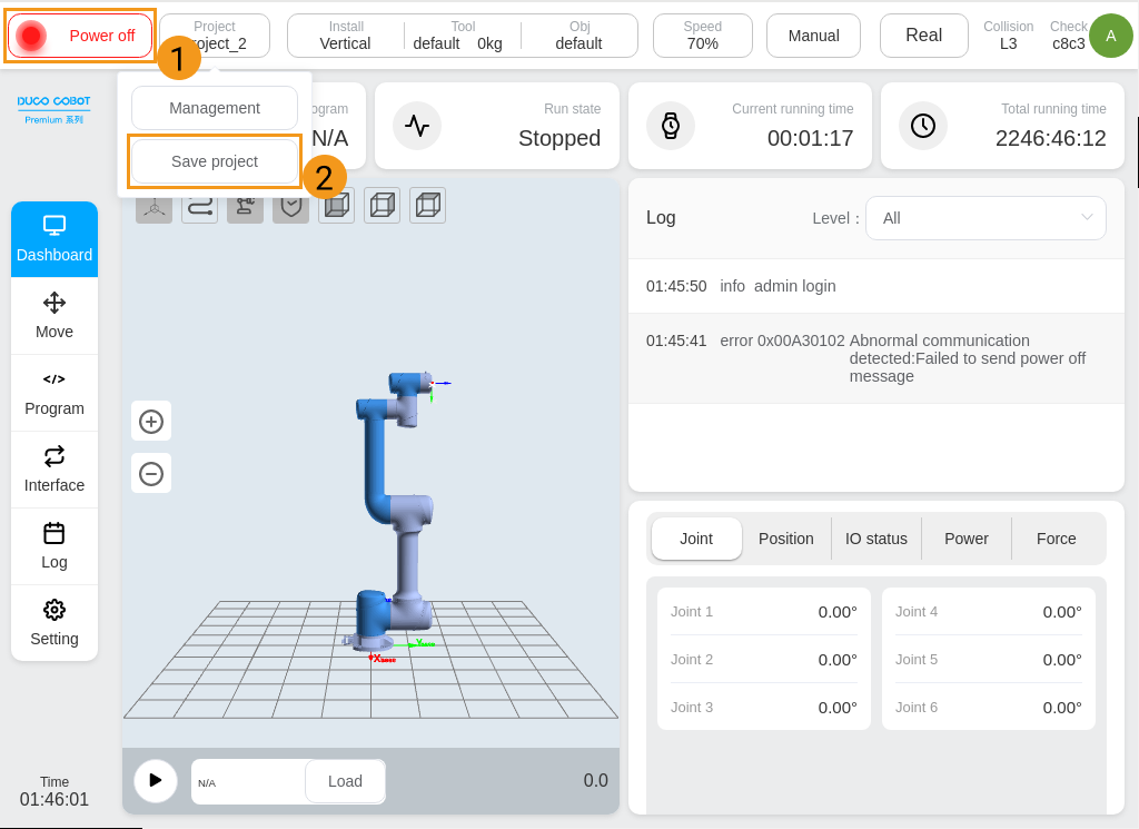Click Project on the upper-left of the teach pendant. Select Management in the drop-down menu.