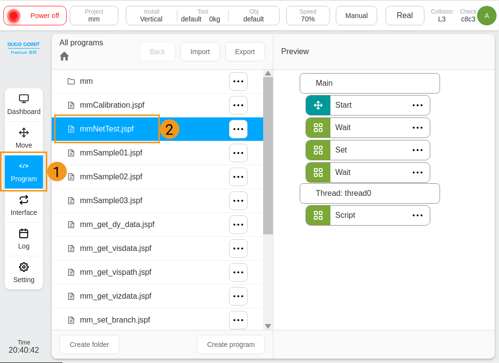 Click Program on the left side panel. Find and double-click the mmNetTest.jspf program in the “All programs” panel.