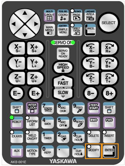 After pressing the SERVO ON READY key on the teach pendant, hold down the enable switch on the back of the pendant with one hand (wait until the other hand finishes the operation before releasing it). With the other hand, press the MODIFY key and then the ENTER key to update position variable P099 to the current position. Make sure that the data type of P099 is set to the robot type and the tool is 00.