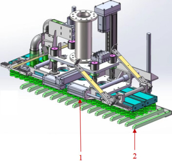 When designing the gripper, you need to consider the weight and suction area of each carton first, and then the overall picking and collision issues. For light, airtight, cartons with large adhesion areas, the stacking form may not be a critical consideration in gripper design. As shown below, 1 is the vacuum gripper, and 2 is the carton.