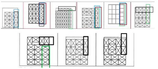 When designing the gripper, you need to consider factors such as the carton’s own weight, material permeability, incoming pallet pattern, carton specifications, etc. As shown in the figure below, the boxes within colored frames can be grouped for multi-picking.