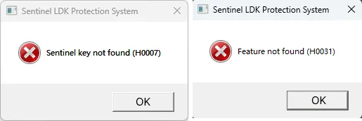 After opening the encrypted software, an error message “Sentinel key not found (H0007)” or “Feature not found (H0031)” popped up.