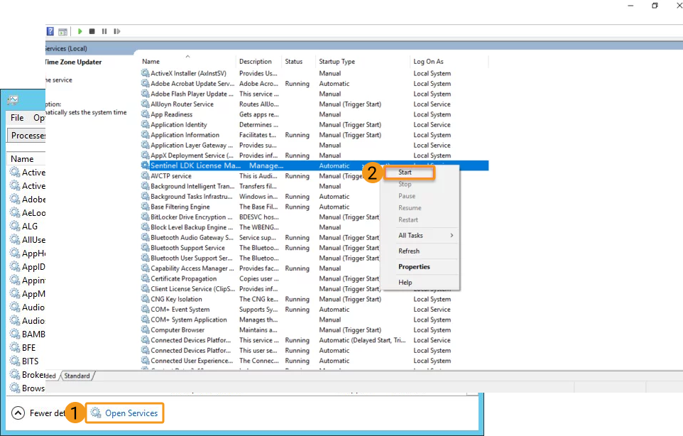 In Task Manager, click theOpen Services button in the lower part of the Services tab. Then, right-click Sentinel LDK License Manager and select Start to start the Sentinel LDK License Manager service.