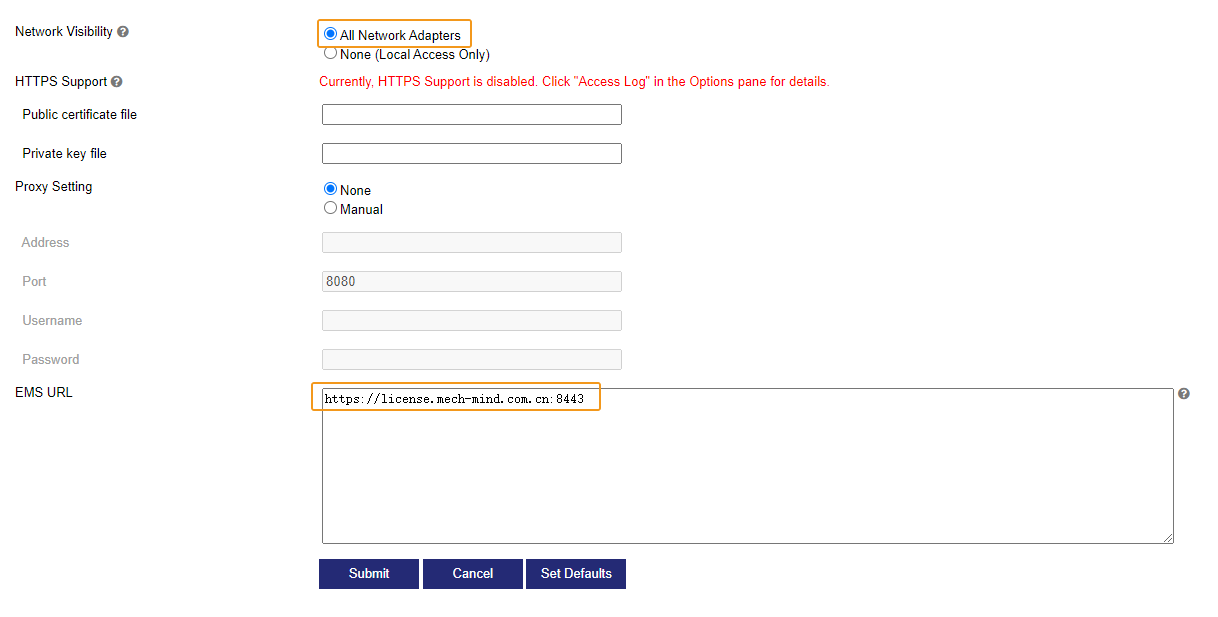 In the left-side navigation pane of the Sentinel Admin Control Center page, choose . On the page that appears, set Network Visibility to All Network Adapters, and enter “https://license.mech-mind.com.cn:8443/” in the EMS URL section. Then, click Submit.