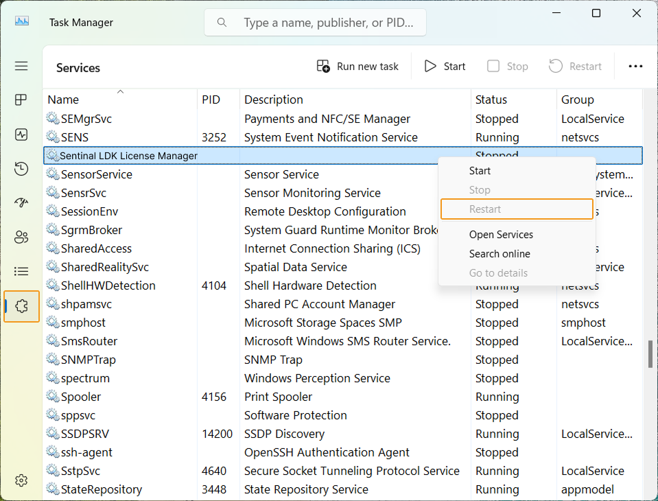 In Task Manager, click the Open Services button in the lower part of the Services tab. Then, right-click Sentinel LDK License Manager and select Restart to restart the Sentinel LDK License Manager service.