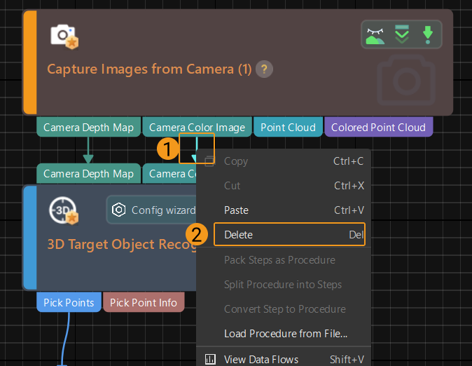 Connections can only be created among ports of the same data type. For example, the output port of Cloud(XYZ-Normal) can only be connected to the input port of Cloud(XYZ-Normal). Ports of different data types can’t be connected. |