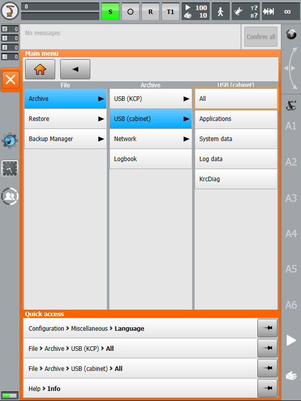 Plug the flash drive that stores the backup file into the controller, and make sure that the flash drive shows up on the teach pendant.