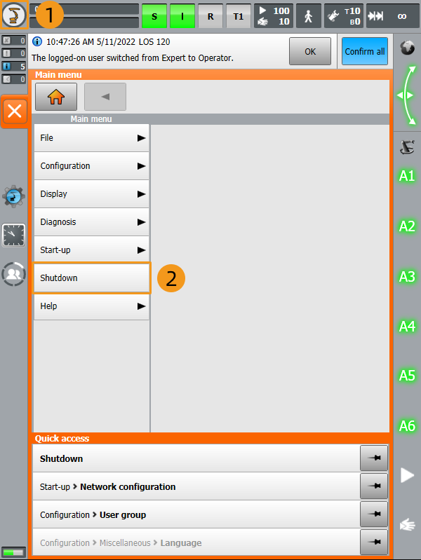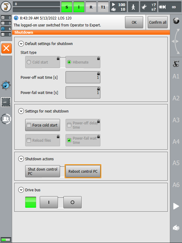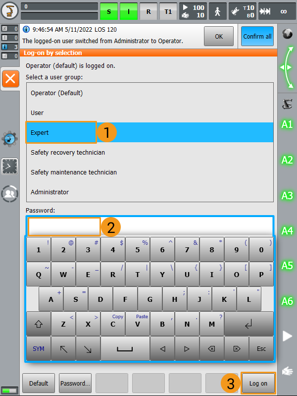 Select Expert, enter the password (the default password is kuka), and then click Log on.