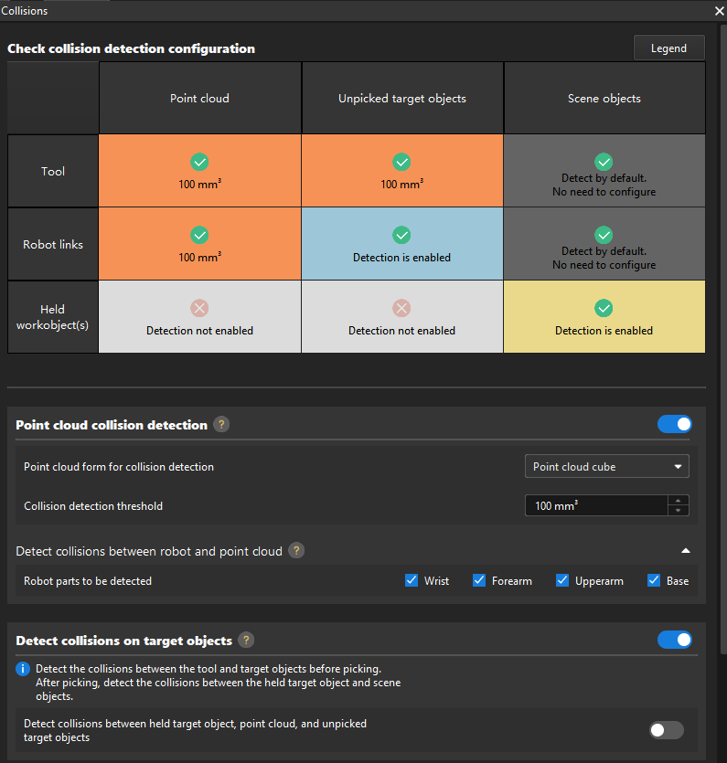 Since the number and positions of target objects in the bin vary, you need to obtain the point cloud of the target object from the vision project for collision detection. Therefore, you need to enable Point cloud collision detection and select “Point cloud cube” as the point cloud form for collision detection. In addition, please set the Collision detection threshold parameter according to the actual situation.