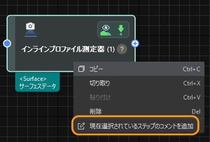 プロジェクト編集エリアでステップを選択し、右クリックメニューから 現在選択されているステップのコメントを追加 を選択します。表示されたウィンドウにコメント内容を入力し、入力後は画面上の任意の場所をクリックすると設定が完了します。