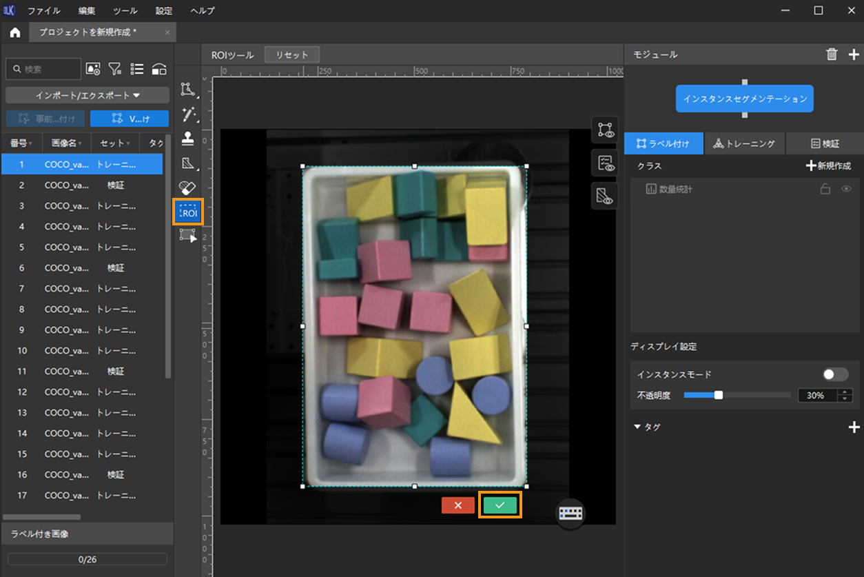 をクリックして、積み木が配置されたボックスを ROI として選択してから右下の