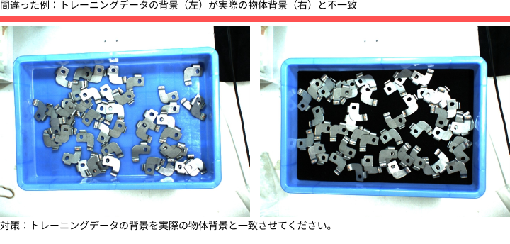 • 照明環境:現場では照明が変化するので、データセットに異なる照明下で取得した画像が含まれている必要があります。