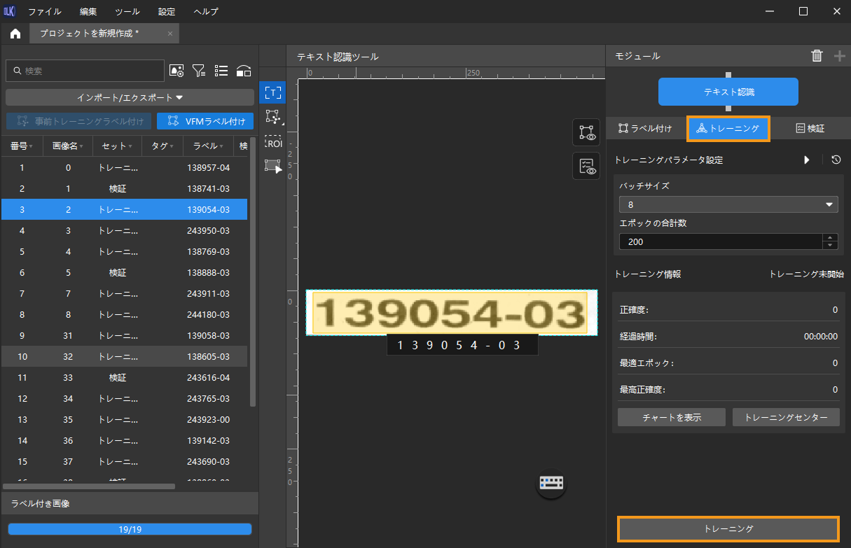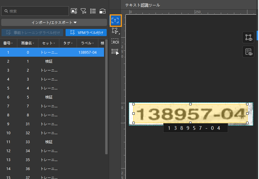 画像のラベル付け:画像の左側のツールバーから「テキスト認識ツール」を選択してラベルを付けます。「テキスト認識ツール」を使用してテキスト領域を選択すると認識結果が自動的に生成されます。その後手動で確認します。このように、正確なラベル付けと結果の確認は大事です。