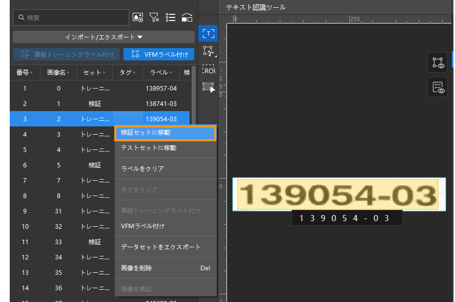 をクリックし、スライダをドラッグしてその割合を調整することができます。トレーニングセットも検証セットもすべてのカテゴリーのテキスト画像が含まれることを確認してください。そうでなければ画像の名前を右クリックして「トレーニングセットに移動」あるいは「検証セットに移動」をクリックして画像のカテゴリーを変更することができます。