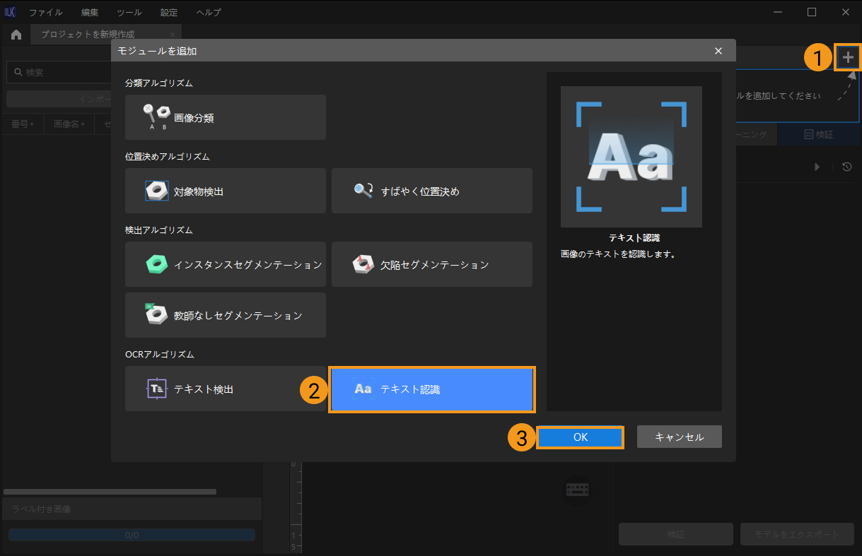 プロジェクトを新規作成して「テキスト認識」モジュールを追加:ホーム画面の プロジェクトを新規作成 をクリックし、プロジェクトディレクトリを選択してプロジェクト名を入力し、新しいプロジェクトを作成します。右上の