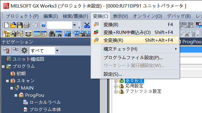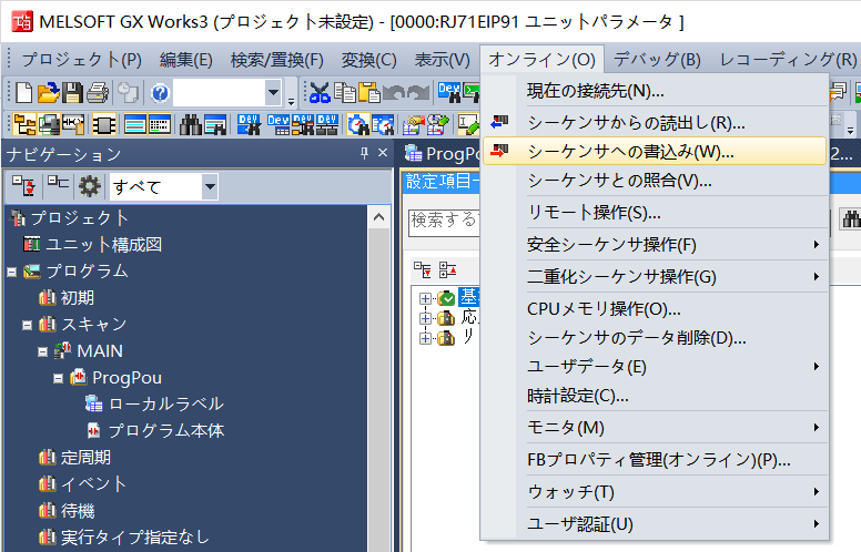 GX Works3 ソフトウェア画面で、メニューバーで を順番にクリックします。