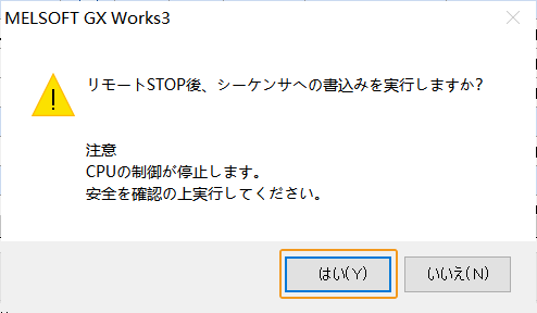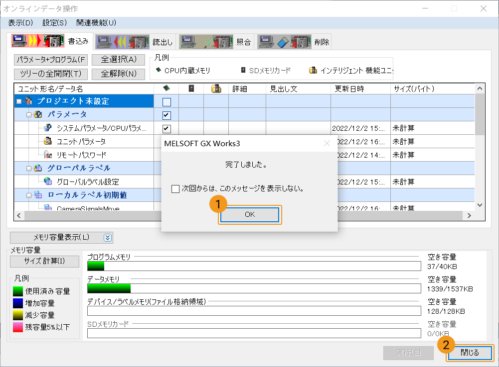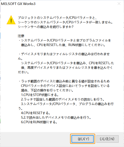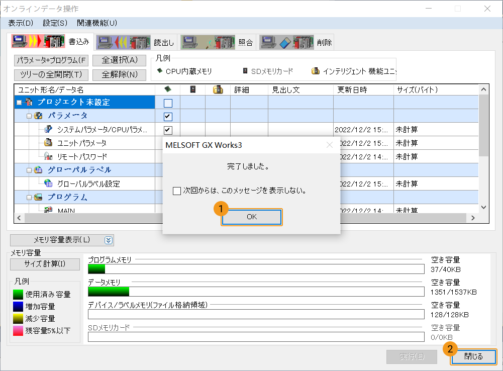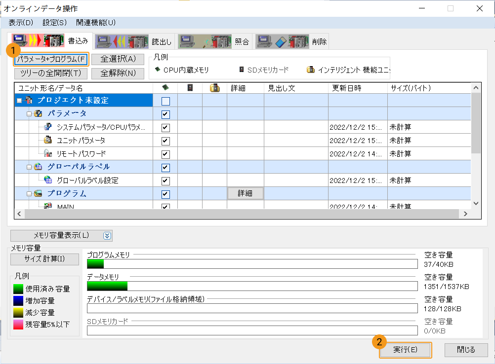 すると、オンラインデータ操作 ウィンドウがポップアップします。このウィンドウで 書込み タブを選択し、パラメータ+プログラム をクリックして 実行 をクリックします。
