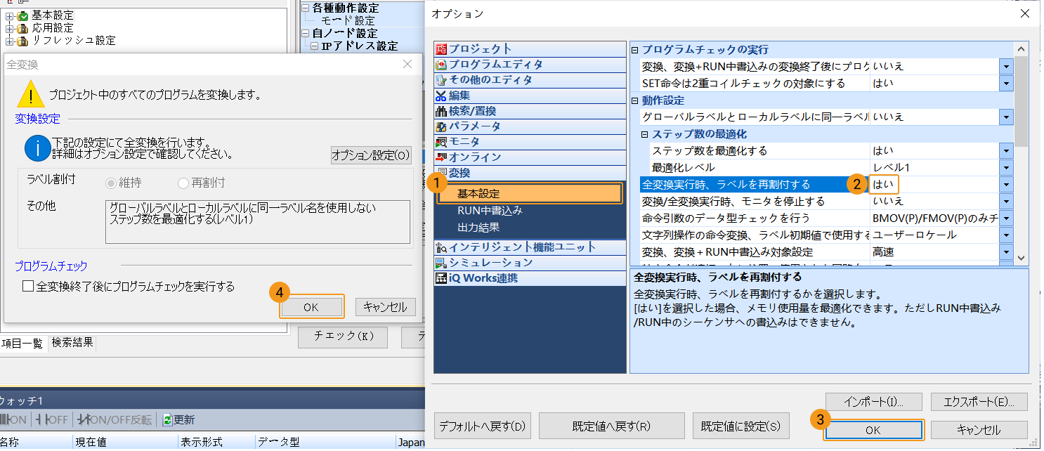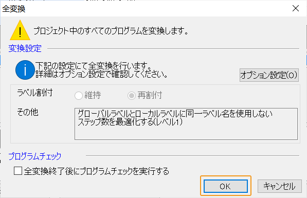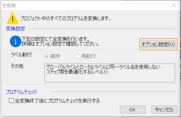 オプション ウィンドウで、左側の 基本設定 をクリックし、「全変換実行時、ラベルを再割付する」を はい に設定してから OK をクリックします。