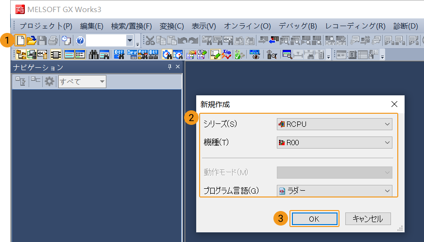 GX Works3ソフトウェアを起動し、ツールバーの 新規作成 アイコンをクリックします。このウィンドウで、シリーズを RCPU に、機種を R00 に、プログラム言語を ラダー に設定してから、OK をクリックします。