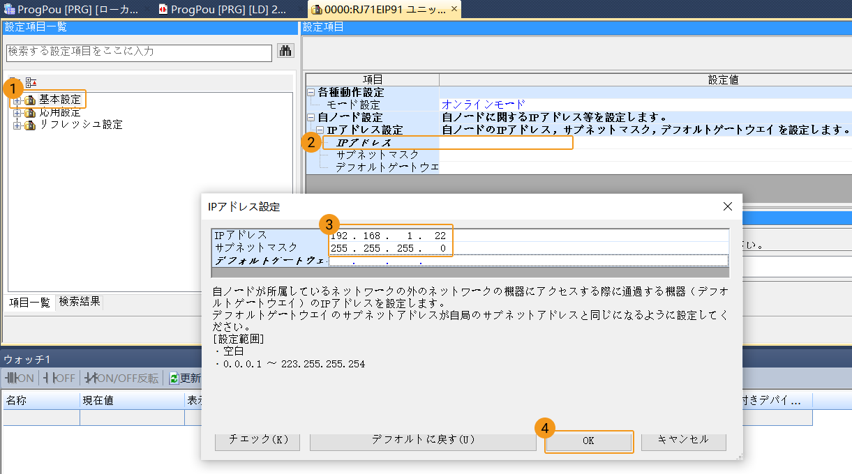 ハードウェアの接続関係は下図のとおりです。各機器のIPアドレスは互いに異なる必要がありますが、同一のサブネット内に設定し、かつ他の機器で使用されていない必要があります。PLCのIPアドレス設定については、以下の説明をご参照ください。IPCおよびGX Works3ソフトウェアをインストールしたPCのIPアドレス設定については、こちらのリンク をご参照ください。