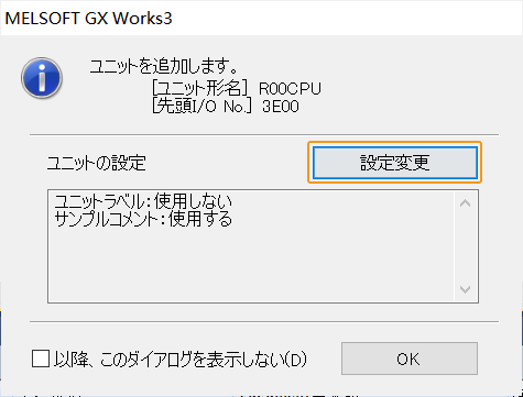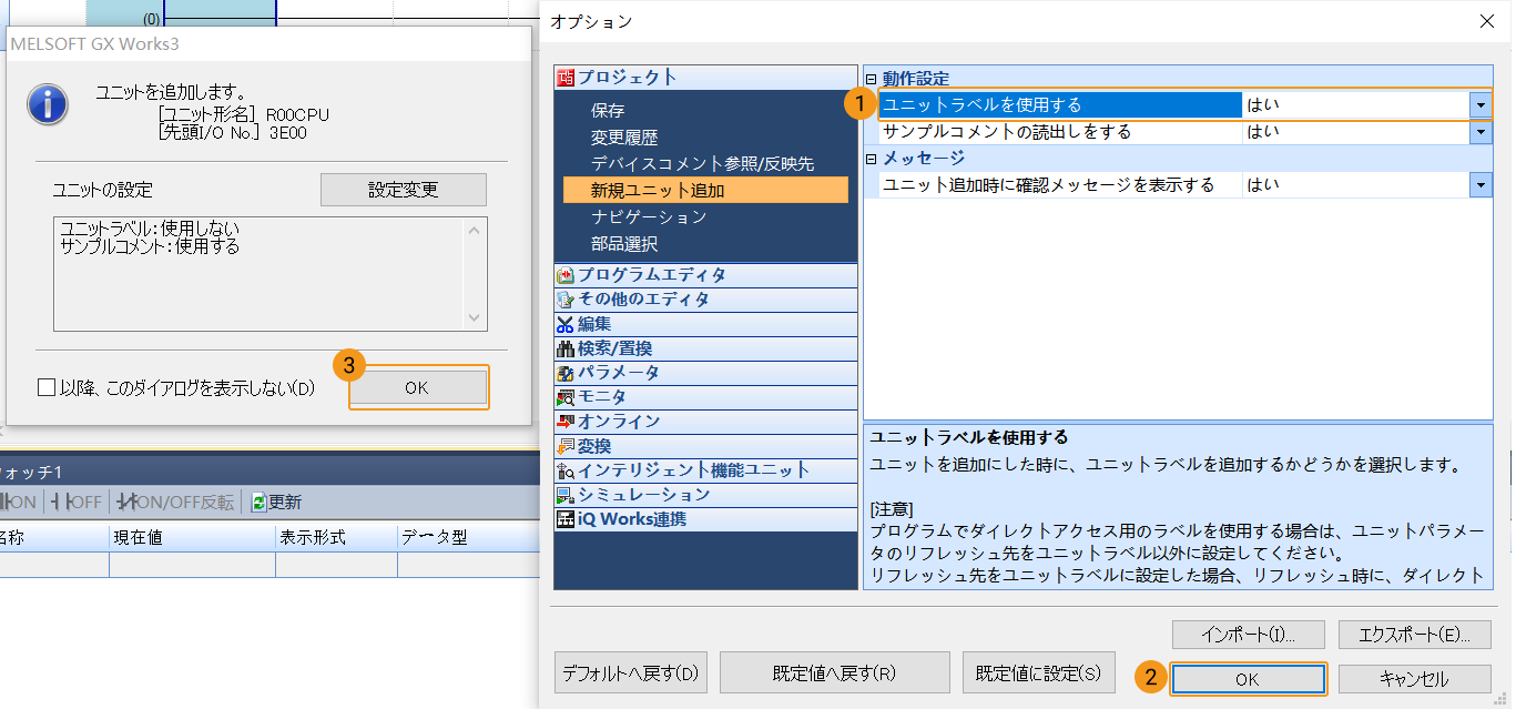 オプション で、「ユニットラベルを使用する」を はい に設定して OK をクリックします。その後、ユニット追加 のウィンドウに戻って OK をクリックします。
