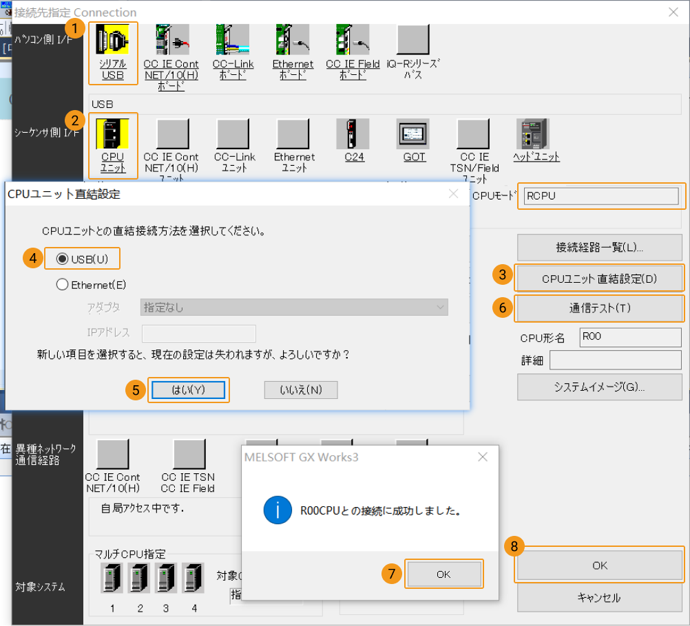 接続先指定 Connection ウィンドウに戻り、通信テスト をクリックします。R00CPUとの接続に成功しました というメッセージが表示された場合、GX Works3ソフトウェアがPLCと正常に通信できたことを意味します。