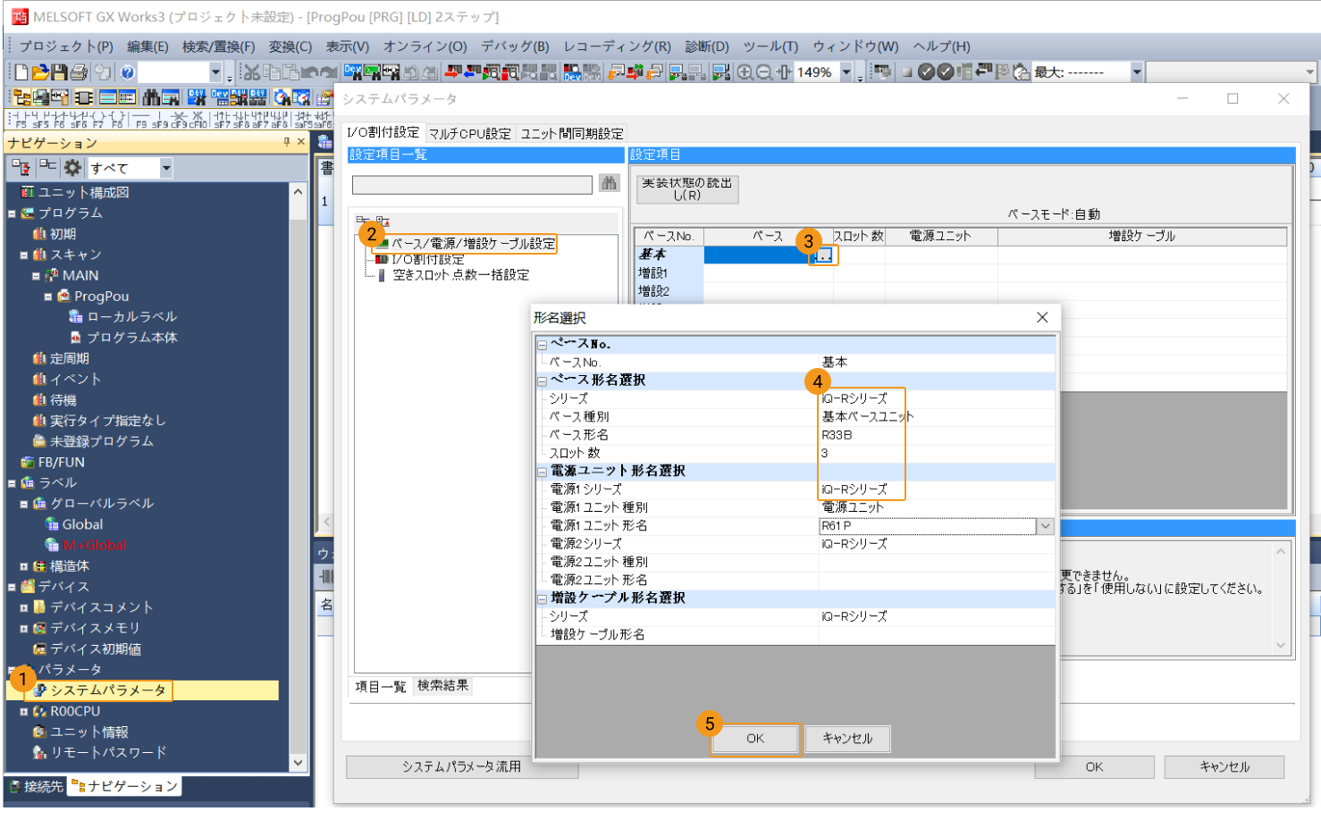 システムパラメータ ウィンドウで、「I/O割付設定」タブで ベース/電源/増設ケーブル設定 を選択し、選択アイコンをクリックします。すると、形名選択 ウィンドウがポップアップします。