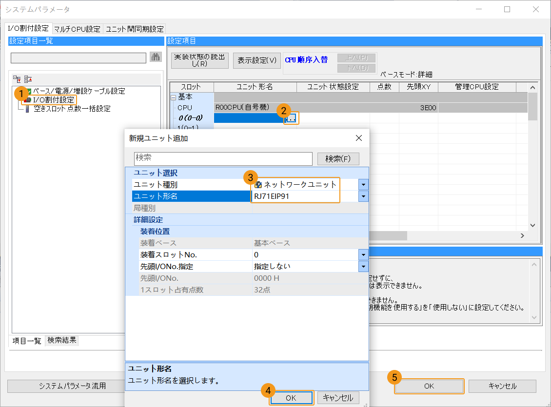 システムパラメータ 画面で、「I/O割付設定」タブで I/O割付設定 を選択し、「スロット0」の後にある選択アイコンをクリックします。すると、新規ユニット追加 画面が表示されます。