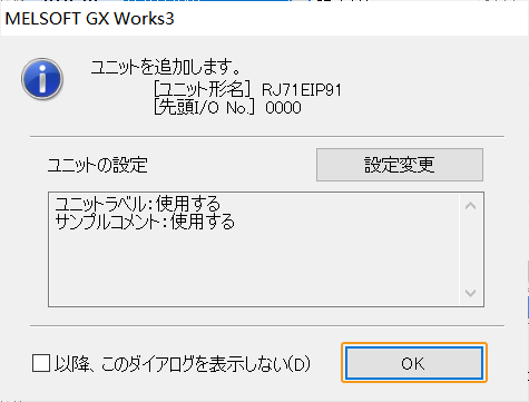 新規ユニット追加 ウィンドウで、ユニット形名を ネットワークユニット に、ユニット形名を RJ71EIP91 に選択し、OK をクリックします。