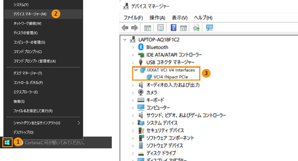 IPCを起動し、Windowsのアイコンを右クリックしてデバイスマネージャーを開き、ドライバーソフトウェア VCI4 INpact PCIeがインストールされていることを確認します。