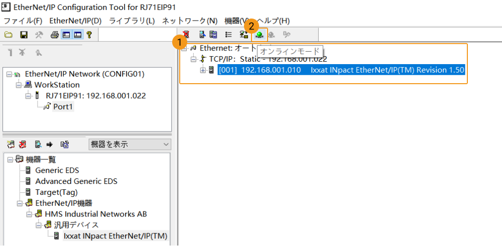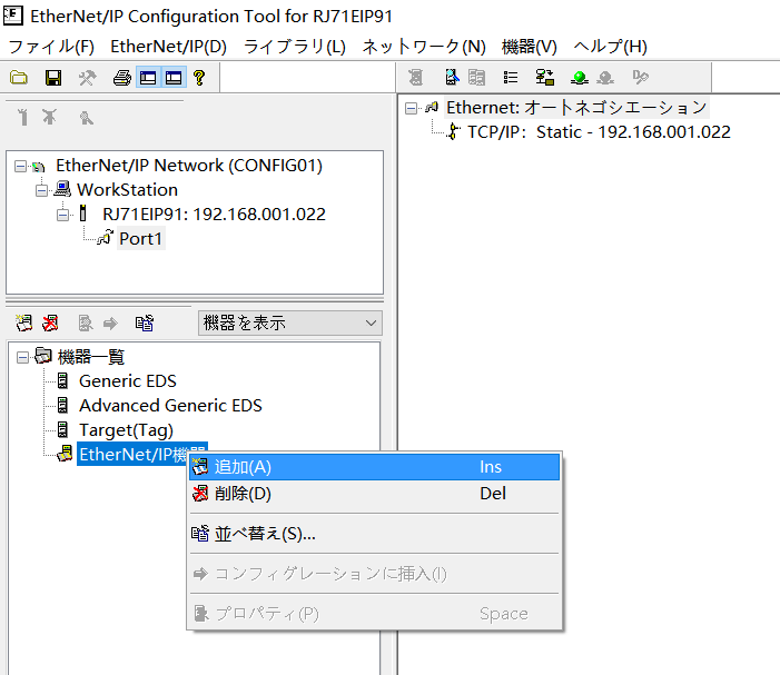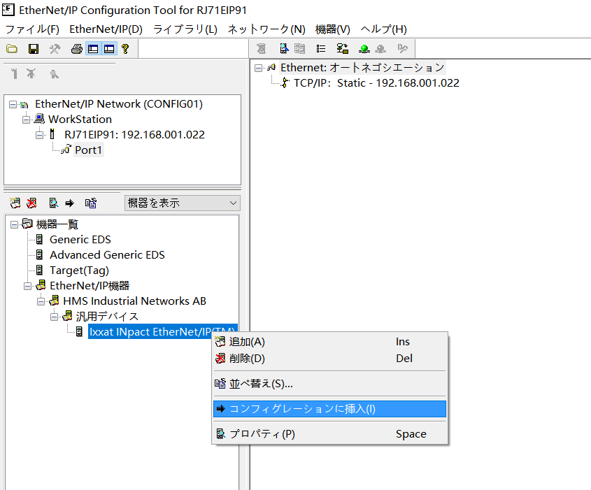EDSファイルが正常に追加された後、EtherNet/IP Devices/HMS Industrial Networks AB/Generic Device を展開します。Ixxat INpact EtherNet/IP(TM) を右クリックし、コンフィグレーションに挿入 を選択してEtherNet/IPネットワークに追加します。すると、設定ウィンドウがポップアップします。