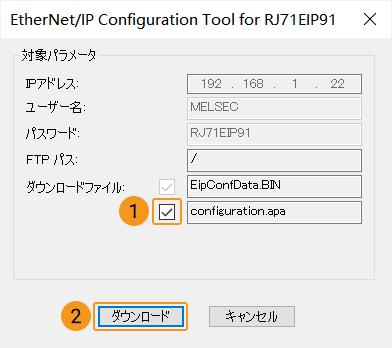 ポップアップウィンドウで「configuration.apa」にチェックを入れます。これにより、設定ファイル(configuration.apa)がダウンロード可能となり、後続でのアップロードや再編集が容易になります。その後、ダウンロード をクリックします。
