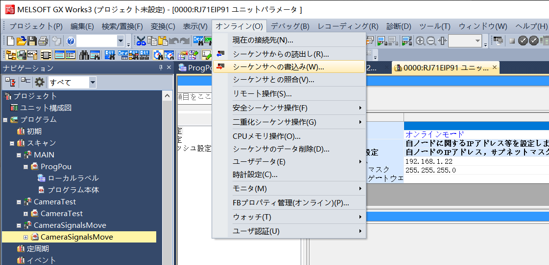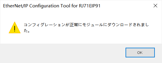 オンラインモード で、ツールバーの ダウンロード アイコンをクリックし、現在設定されたパラメータをEtherNet/IP通信ユニットRJ71EIP91に書き込みます。