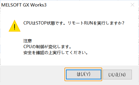 CPUユニット直結設定 をクリックします。表示されたウィンドウで USB を選択して、はい をクリックします。