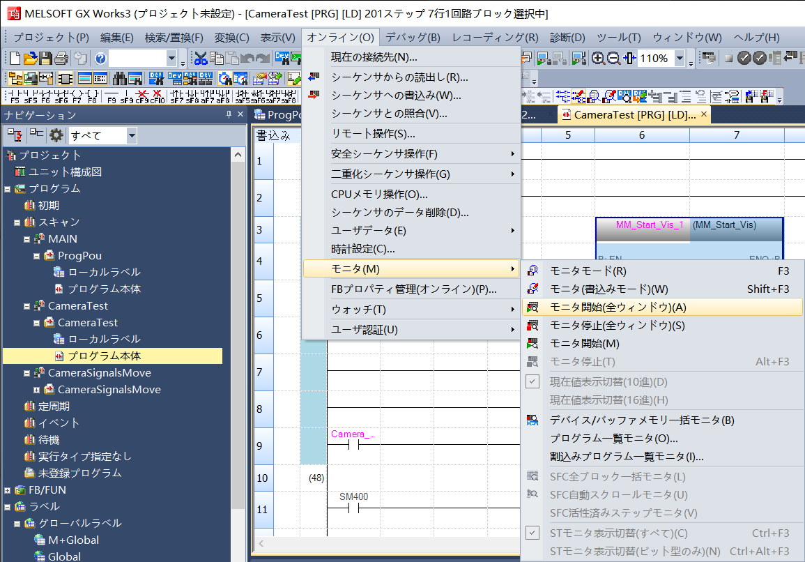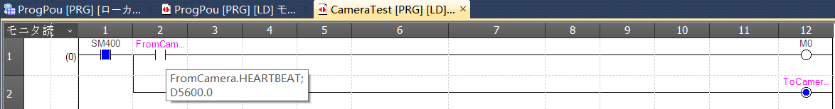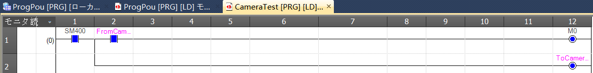 GX Works3ソフトウェア画面で、CameraTest プログラム本体の下にあるイネーブルスイッチ「ToCamera.COMM_ENABLE 」を常にONにします。