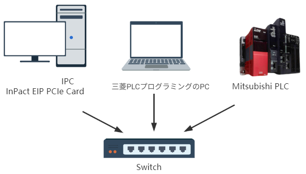 ハードウェアの接続関係は下図のとおりです。各機器のIPアドレスは互いに異なる必要がありますが、同一のサブネット内に設定し、かつ他の機器で使用されていない必要があります。PLCおよび通信ネットワークカードのIPアドレス設定については、以下の説明をご参照ください。IPCおよびGX Works3ソフトウェアをインストールしたPCのIPアドレス設定については、こちらのリンク をご参照ください。
