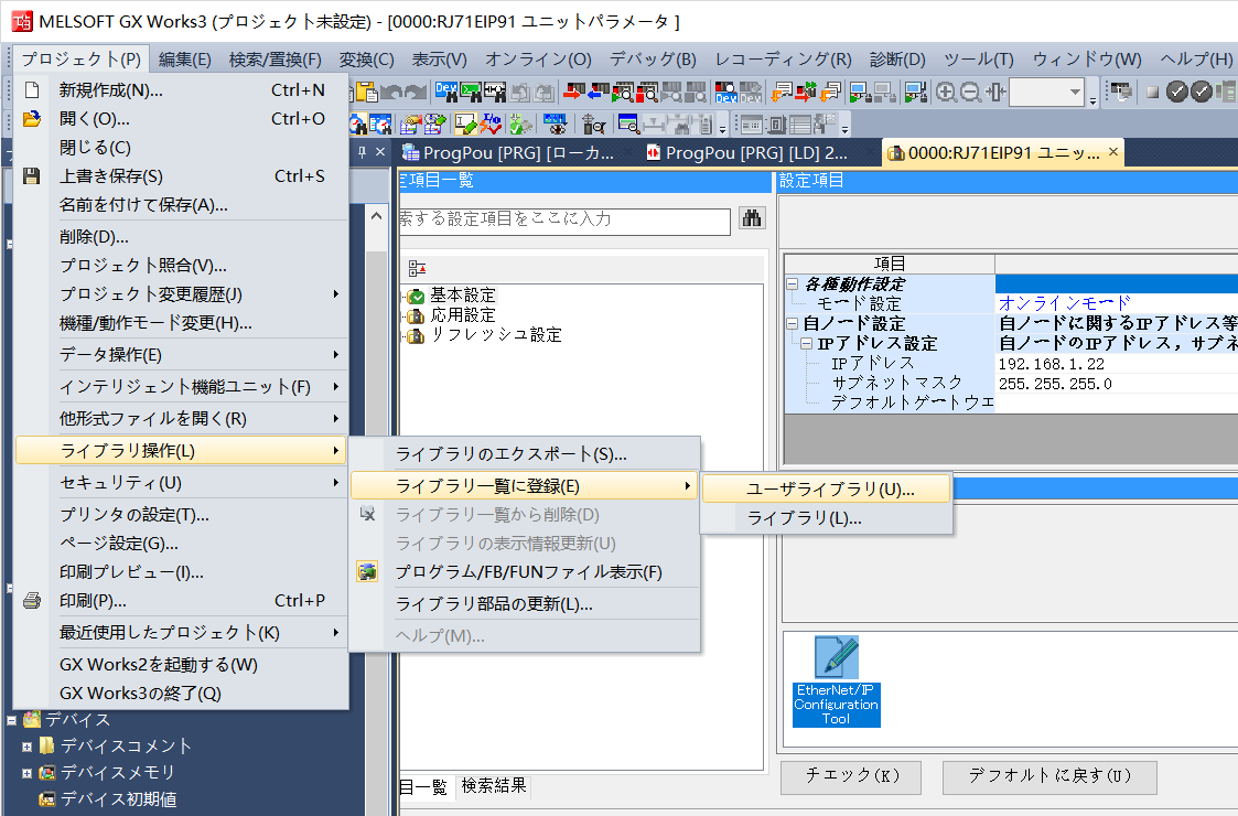 PLCサンプルプログラムファイル:iQ-R_RJ71EIP91.usl。このファイルには以下のユーザーライブラリが含まれています。