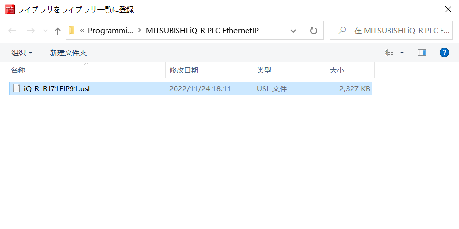 ライブラリをライブラリ一覧に登録 画面で、ビジョン通信のサンプルライセンスファイル「iQ-R_RJ71EIP91.usl」を選択して 開く をクリックします。このサンプルライセンスファイルは、事前にIPCからコピーする必要があります。